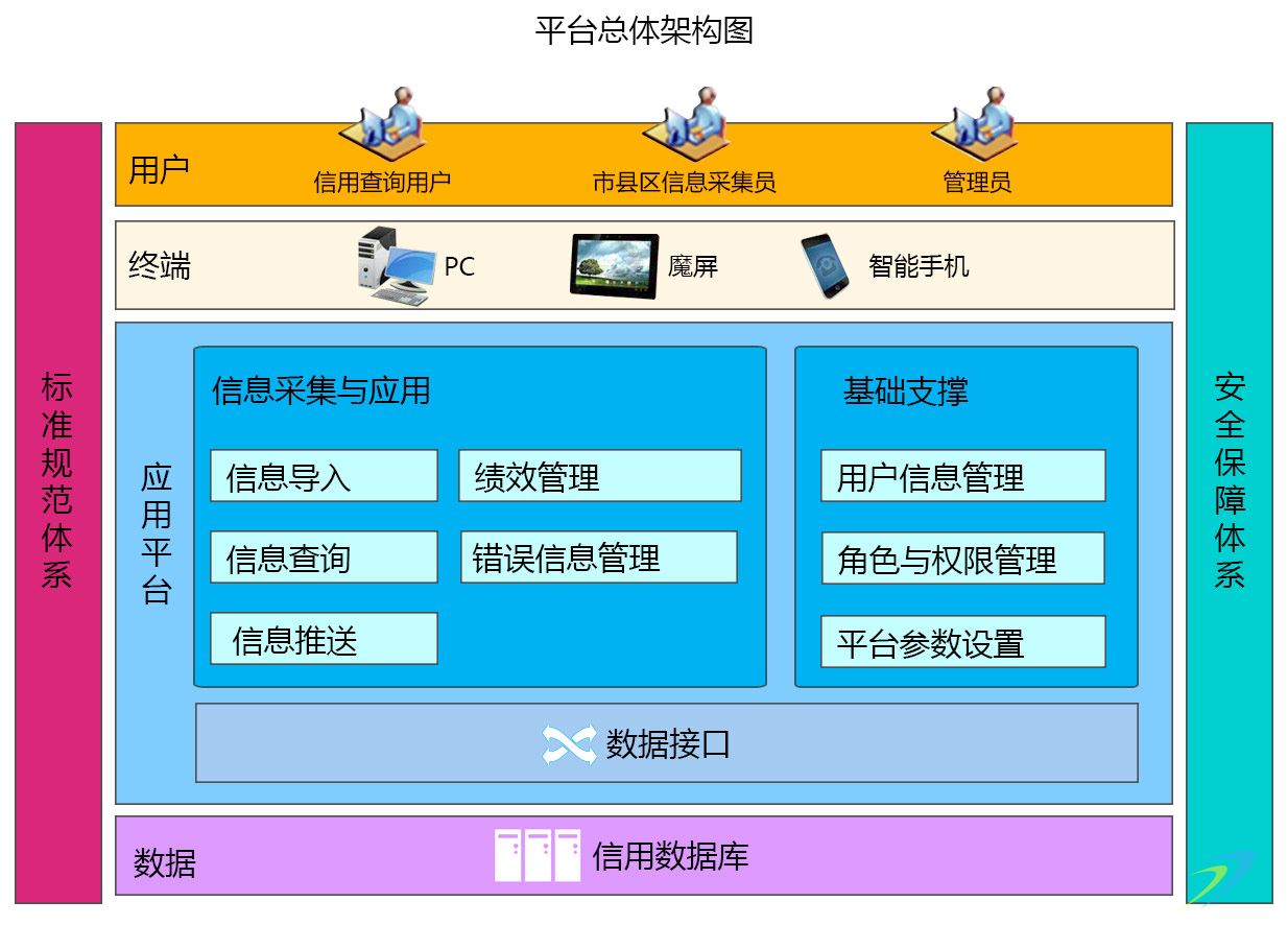 平臺(tái)的主要用戶為信用查詢用戶、市縣區(qū)信息采集員,平臺(tái)管理員。用戶通過(guò)終端訪問(wèn)應(yīng)用平臺(tái)各項(xiàng)功能,包括信用信息查詢、導(dǎo)入、推送、錯(cuò)誤信息管理;管理員可進(jìn)行信用歸集績(jī)效管理,平臺(tái)設(shè)置。平臺(tái)提供數(shù)據(jù)接口,與外部應(yīng)用進(jìn)行信息交換。
